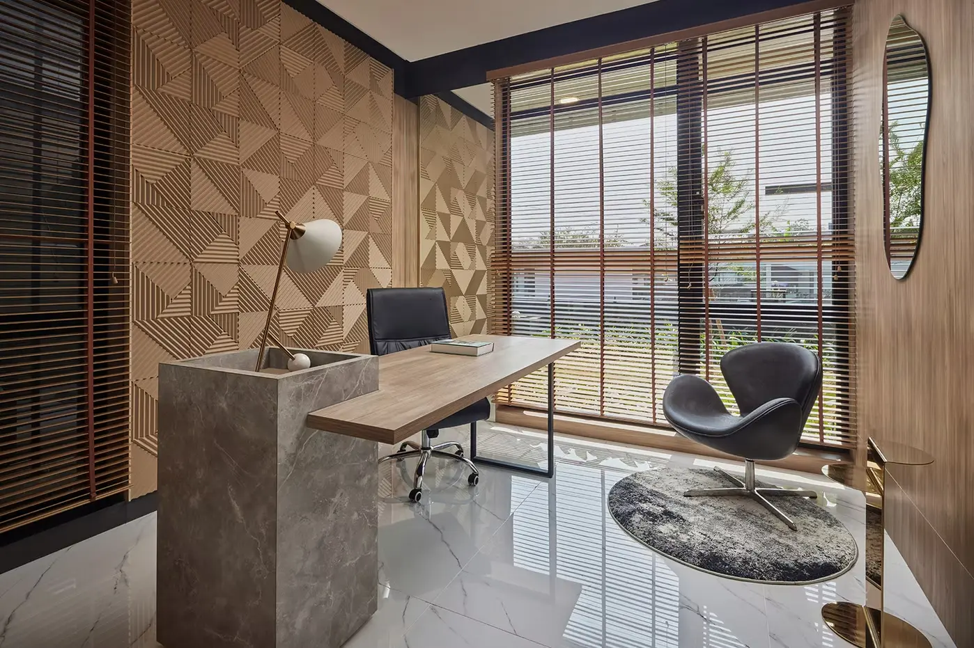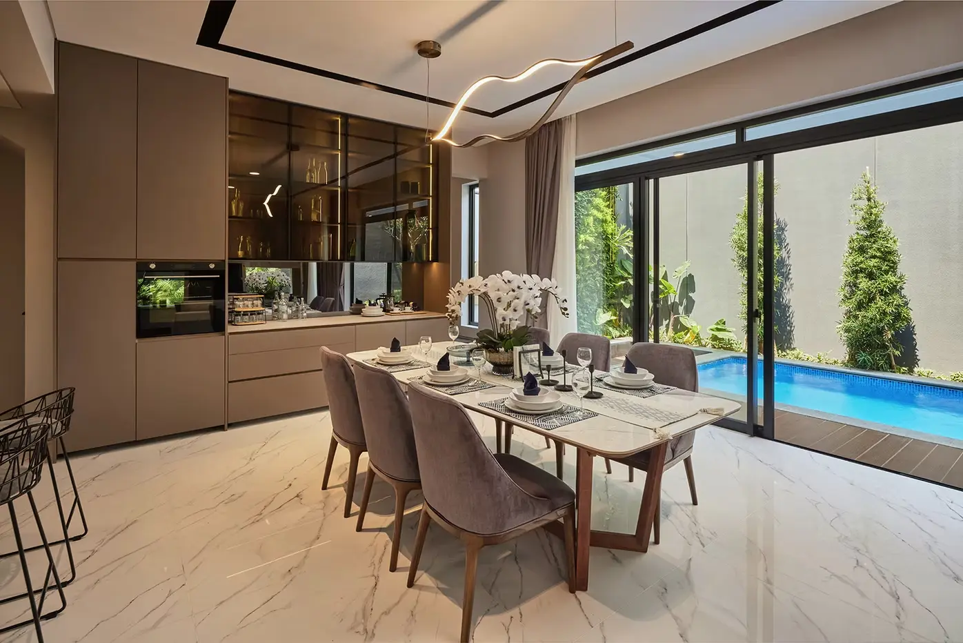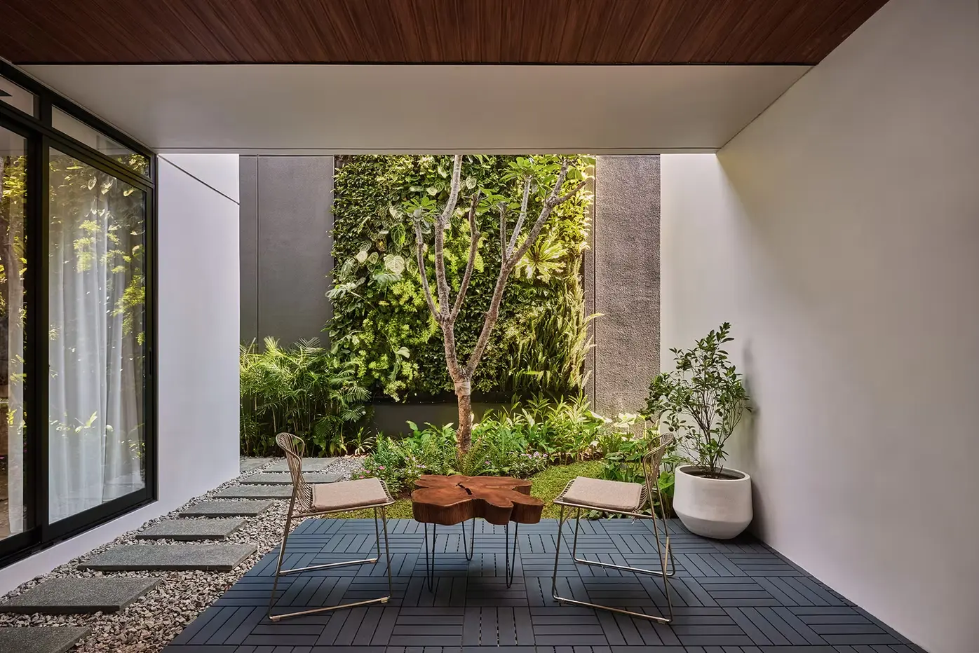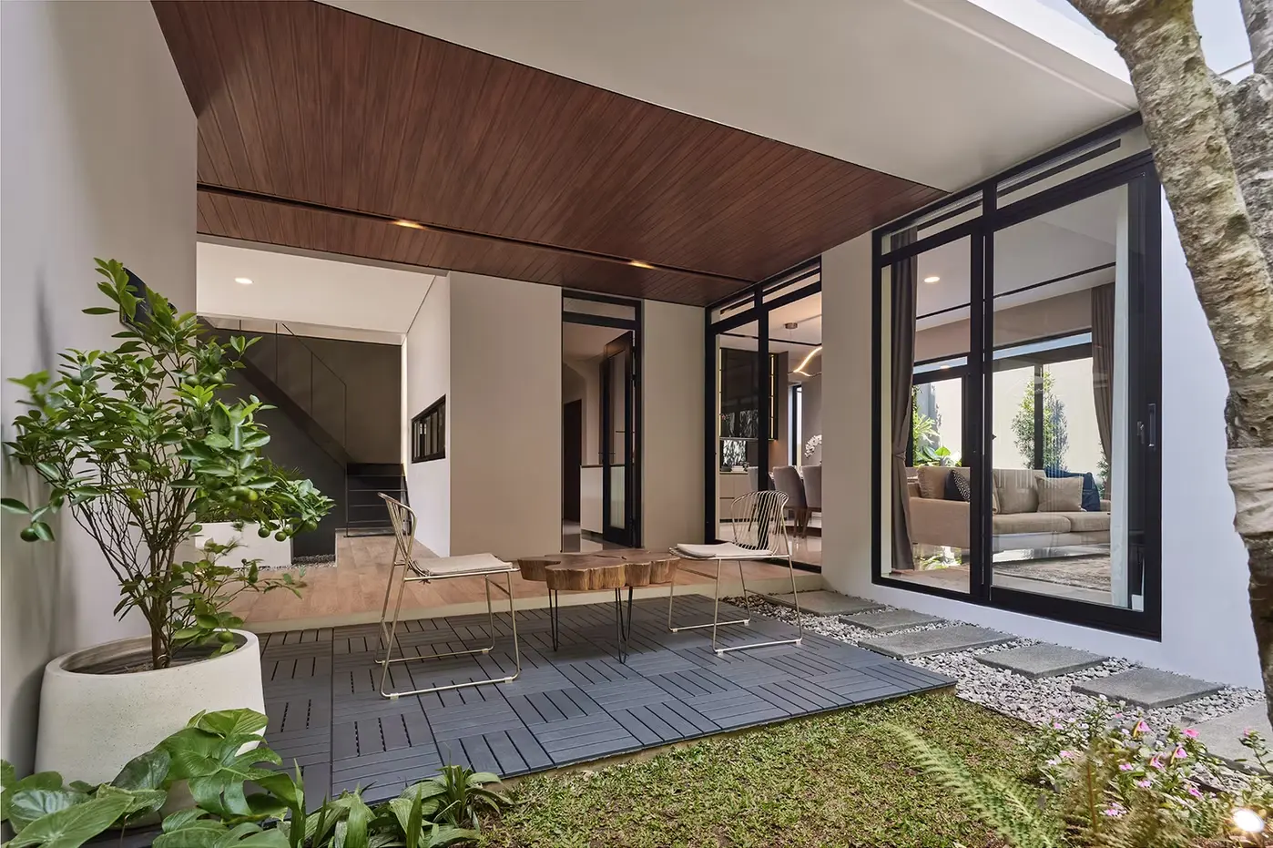 Desain arsitektur oleh Hadi Vincent Architect yang menciptakan gubahan massa dan ruang rumah yang nyaman sekaligus fasade yang mewah menggunakan quadra (ultimate design surface). Inner courtyard di pusat rumah seperti oase, aliran udara & cahaya alami yang leluasa hingga ke bagian tengah rumah. Area living & dining yang melebar dan berinteraksi maksimal dengan area outdoor belakang menjadi ruang bersama yang nyaman dan menyenangkan dengan bukaan melebar sehingga menciptakan pengalaman indoor dan outdoor yang kaya.