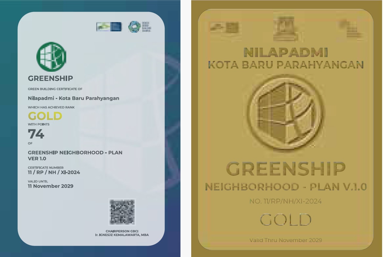 Tatar Nilapadmi Kota Baru Parahyangan meraih sertifikasi greenship neighborhood peringkat "Gold" dari Green Building Council Indonesia (GBCI).